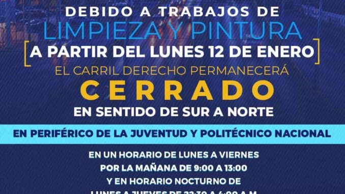 Chihuahua .- El Gobierno Municipal de Chihuahua, a través de la Dirección de Mantenimiento Urbano, realizará limpieza y pintura en el bajo puente ubicado en el cruce del Periférico de la Juventud y la avenida Politécnico Nacional, labores que comprenderán a partir de la noche del lunes 12 de enero, hasta el viernes 6 de febrero, por lo que exhortan a circular con precaución ya que se cerrará un carril.