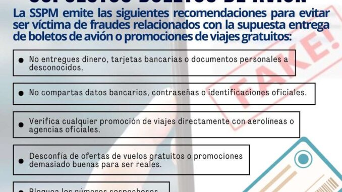 Ciudad Juárez .- La Secretaría de Seguridad Pública Municipal, a través de la Dirección de Investigación y el Área de Delitos Cibernéticos, alerta a la ciudadanía sobre una modalidad de fraude relacionada con la supuesta entrega de boletos de avión gratuitos.