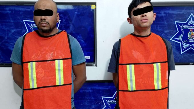 Ciudad Juárez.- Agentes de la Secretaría de Seguridad Pública Municipal arrestaron a Julio Adrian D. M. y Julio Gustavo A. R., por su presunta responsabilidad en la comisión del delito de posesión de vehículo con reporte de robo y delitos contra la salud.
