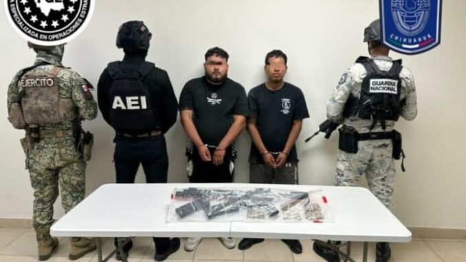 Elementos de la Agencia Estatal de Investigación (AEI) adscritos a la Fiscalía Especializada en Operaciones Estratégicas (FEOE) en Ciudad Juárez, con apoyo del Ejército Mexicano, detuvieron este viernes 3 de octubre, a dos hombres en flagrancia por los delitos de violación a la ley general de arma de fuego y explosivos, y contra la salud.