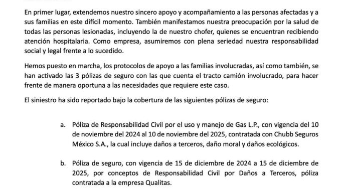 Asimismo, la empresa se dijo comprometida con colaborar estrechamente con las autoridades correspondientes para esclarecer los hechos.