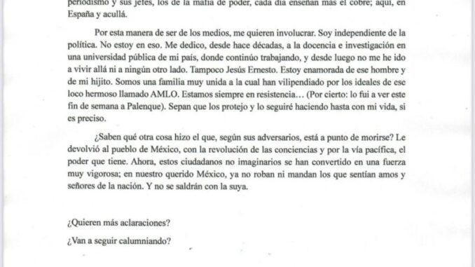 “Estoy enamorada de ese hombre y de mi hijo. Somos una familia muy unida a la cual han vilipendiado por los ideales de ese loco hermoso llamado AMLO. Estamos siempre en resistencia… (Por cierto: lo fui a ver este fin de semana a Palenque). Sepan que los protejo y lo seguiré haciendo hasta con mi vida, si es preciso”, puntualizó.
