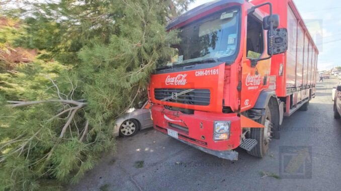La unidad de Coca-Cola intentó evitar vehículos mal estacionados en un tianguis cuando una rama de pino cedió y terminó sobre un Honda Civic; no hubo lesionados
