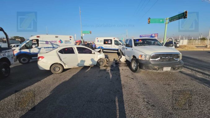 Chihuahua.- Un aparatoso accidente vial registrado en el sur de la ciudad dejó a tres personas valoradas por paramédicos, luego de que una unidad de escolta invadiera el paso de un vehículo de transporte por aplicación.