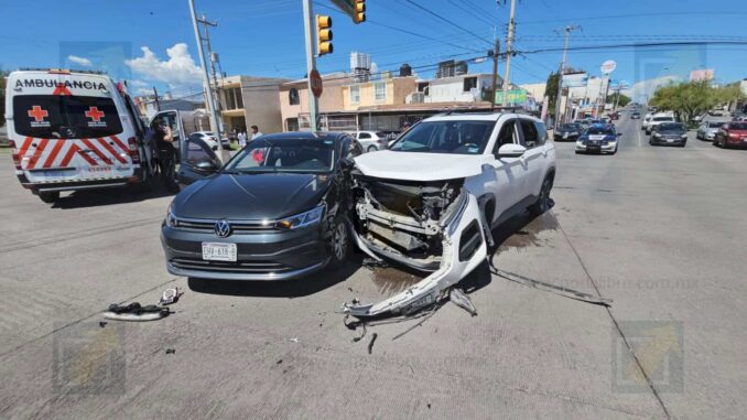 Chihuahua.- Un aparatoso accidente registrado en la colonia Colinas del Sol, en el cruce de la avenida Francisco Villa y la avenida Águilas, dejó como saldo a dos mujeres lesionadas, una de ellas adulta mayor. El percance ocurrió cuando los conductores involucrados afirmaron de manera contradictoria que el semáforo les otorgaba el paso en verde, situación que provocó la colisión en plena intersección.