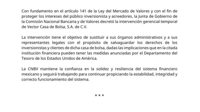 La Junta de Gobierno de la Comisión Nacional Bancaria y de Valores (CNBV) decretó la intervención gerencial temporal de Vector Casa de Bolsa, S.A. de C.V.