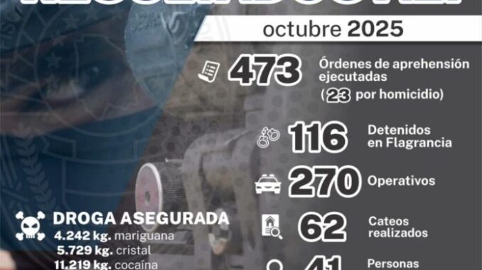 La Agencia Estatal de Investigación, en coordinación con la Fiscalía de Distrito Zona Norte, obtuvieron importantes logros en el combate frontal a los delitos, trabajo que se materializó el pasado mes de octubre, entre otros resultados, con el cumplimiento de 473 órdenes de aprehensión, 23 de ellas por el delito de homicidio.
