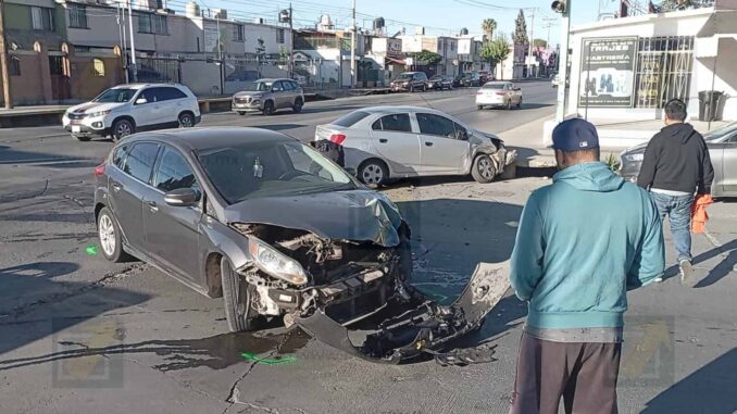 Chihuahua.- Un fuerte accidente vial se registró en el cruce de la avenida Juan Escutia y la calle Manuel González Cossío, donde dos automóviles protagonizaron un aparatoso choque que, pese a la magnitud del impacto, no dejó personas lesionadas.