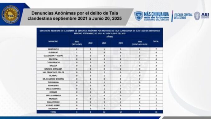 De acuerdo con el informe, las denuncias anónimas corresponden a: Guachochi 7, Guerrero 4, Guadalupe y Calvo 4, Bocoyna 4, Cusihuiriachi 3, Balleza 3, Ignacio Zaragoza 2, San Francisco Del Oro 2, Ocampo 2, Dr. Belisario Domínguez 2, Chihuahua 2, Namiquipa 1, Casas Grandes 1, Rosales 1, Santa Bárbara 1, Morelos 1, Cuauhtémoc 1, Ciudad Juárez 1 y Bachíniva.