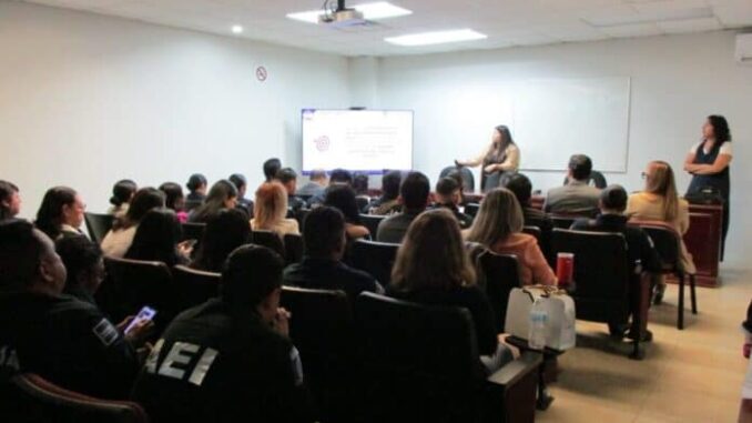 Agentes del Ministerio Público y elementos de la Agencia Estatal de Investigación, participaron de manera activa en el taller impartido por las licenciadas Alejandra Quintana Torres y Guadalupe Zubia Mendoza, del Instituto Chihuahuense de las Mujeres.