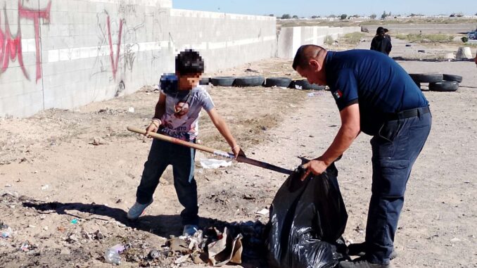 Ciudad Juárez.- En una muestra de colaboración comunitaria y compromiso con el bienestar de la juventud, elementos de la Secretaría de Seguridad Pública Municipal, junto con niños, niñas y adolescentes del fraccionamiento Senderos de Oriente, unieron fuerzas para limpiar y habilitar un lote baldío ubicado en el cruce de las calles Senderos de Grava y Senderos del Occidente, con el objetivo de convertir este espacio en una pequeña cancha de fútbol para el disfrute recreativo de los jóvenes de la colonia.