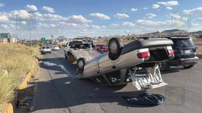 Chihuahua.- Una mujer resultó lesionada la tarde de este viernes luego de un  accidente con volcadura sobre el Circuito Universitario, justo frente al fraccionamiento Santa Clara. De acuerdo con el reporte preliminar, el conductor de un automóvil que se desplazaba de norte a sur perdió el control del volante luego de que una camioneta pick up le cerrara el paso.